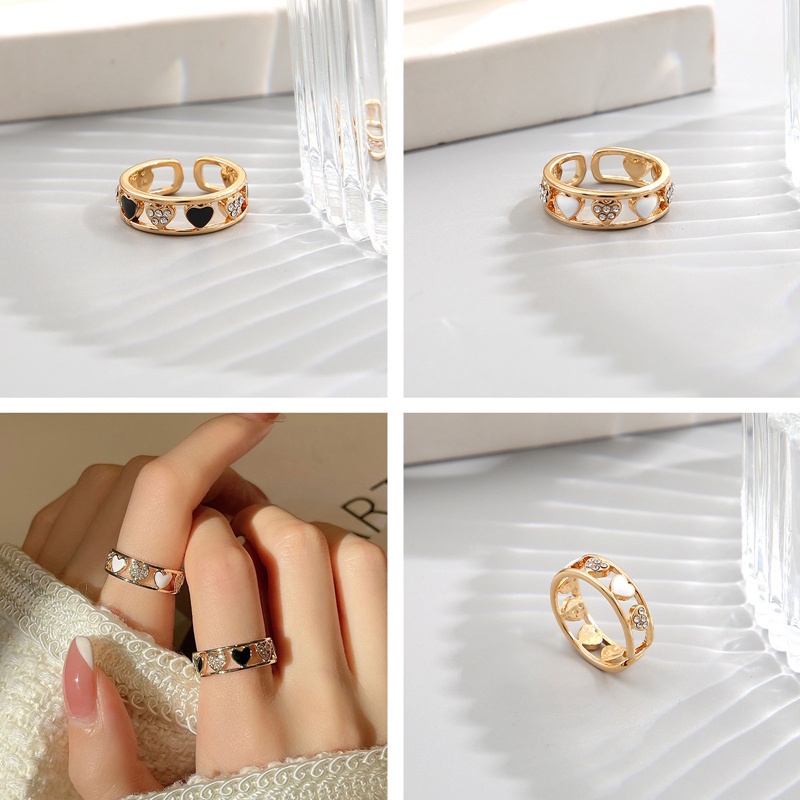Detail Cincin Kristal Sederhana Hitam Putih Jahitan Hati Rings Aksesoris Perhiasan Wanita
