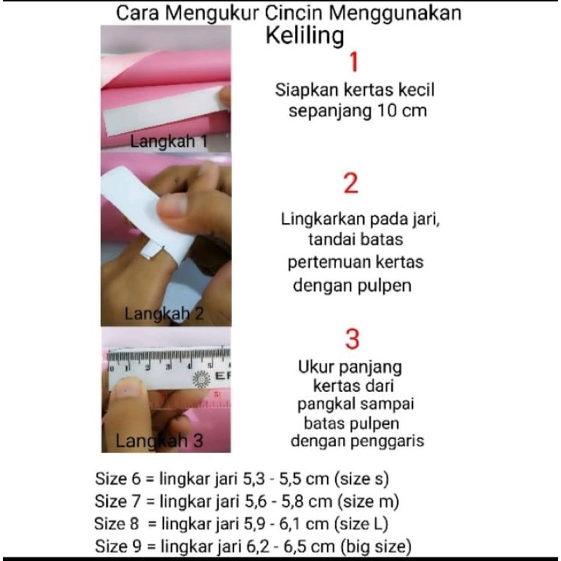 - Tampil elegan, modis & stylish dgn bahan berkualitas yg pastinya sangat nyaman dipakai :) - tdak membuat iritasi atau gatal pada kulit karna berlapis emas 18,24 karat Ukuran ada no.6,7,8,9 kecil.6,7 sedang 8 besar atau jumbo no.9
