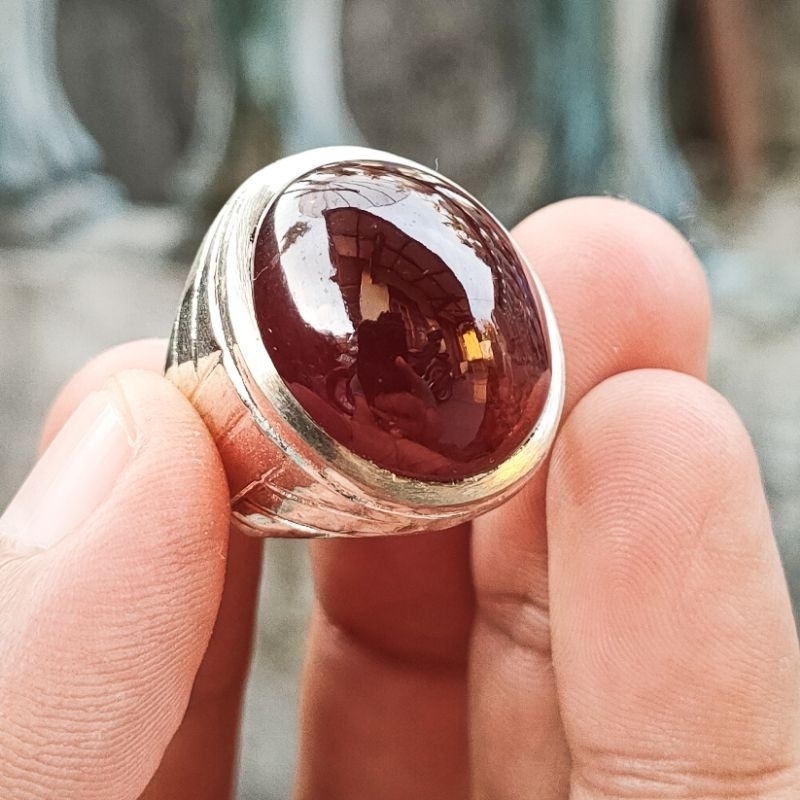 BISMILLAH ID : RED GARNET Market Name : NATURAL HESSONITE GROSSULAR GARNET KODE 02417 Diameter Stone : 22*17*10 mm (Est) Size Ring: 7 Type Ring : Alpaca Super Skala Kekerasan (Mohs) : 8 Origin : Sumatera Barat, Indonesia (IND) Cut : Chabocon Shape: Oval