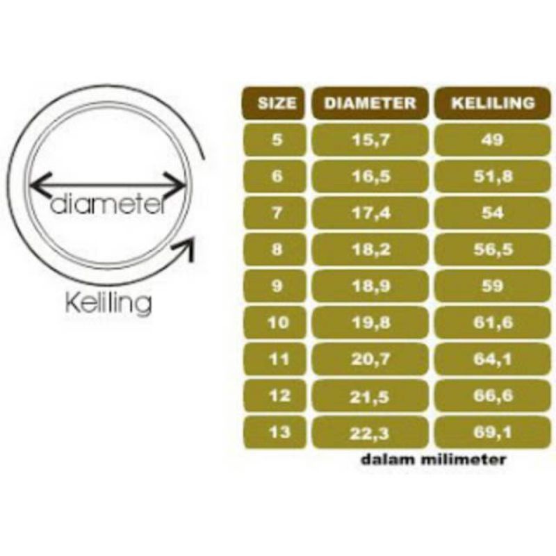 size 6 (setara 16), diameter / garis tengah 1.65cm, keliling lingkaran 4,9 - 5,3cm size 7 (setara 17), diameter / garis tengah 1.65cm, keliling lingkaran 5,4 - 5,8cm size 8 (setara 18), diameter / garis tengah 1.74cm, keliling lingkaran 5.9 - 6,1 cm size 9 (setara 19), diameter / garis tengah 1.84cm, keliling lingkaran 6,2 - 6,5 cm