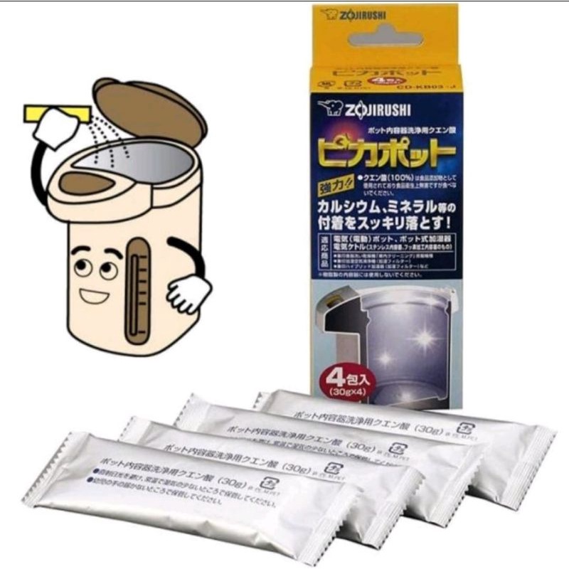 Deskripsi produk : -Bubuk Citric Acid ZOJIRUSHI untuk membersihkan thermos electric (water boiler), steamer, blender atau pun botol minum yang berkerak. Khusus untuk produk Zojirushi -tidak ada masa kadarluarsa bisa digunakan kapan saja -Material Asam Sitrat -Isi : 1 pak (4 sachet x 30 gr)