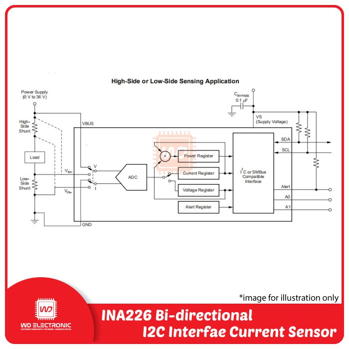 Fitur : Senses Bus Voltages From 0 V to 36 V • High-Side or Low-Side Sensing • Reports Current, Voltage, and Power • High Accuracy: – 0.1% Gain Error (Max) – 10 μV Offset (Max) • Configurable Averaging Options • 16 Programmable Addresses • Operates from 2.7-V to 5.5-V Power Supply • 10-Pin, DGS (VSSOP) Package