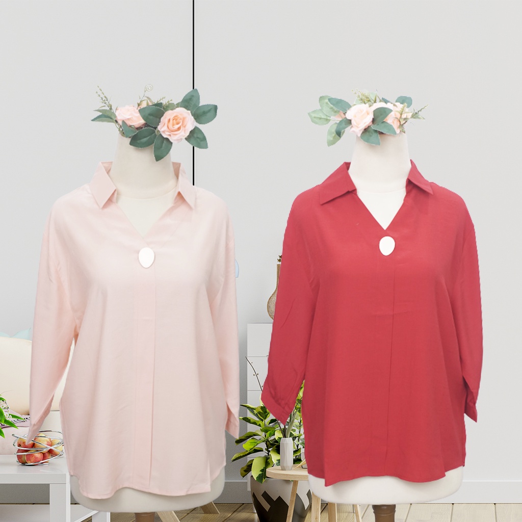 Detail CJWT-0045 TINO TINO BAJU ATASAN WANITA/KEMEJA WANITA LENGAN 3/4 OVERSIZE KOREAN STYLE WITH GOLDEN PIN