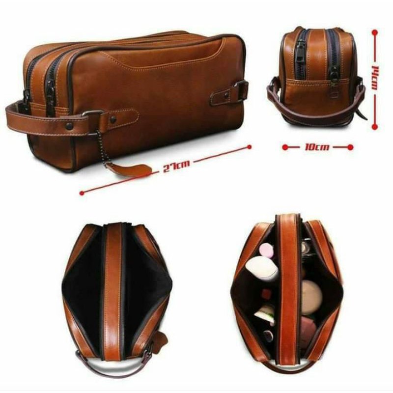 spesifikasi : - bahan kulit sapi asli berKualitas - size 27 x 14 x 10 cm - warna ; hitam. coklat tua , coklat muda, maron. - terdapat 2 slot utama - Waterprof : pouch kulit ini mempunyai fitur waterproff atau tahan air. cukup bersihkan bagian yg terkena percikan air maka seketika akn keren kembali