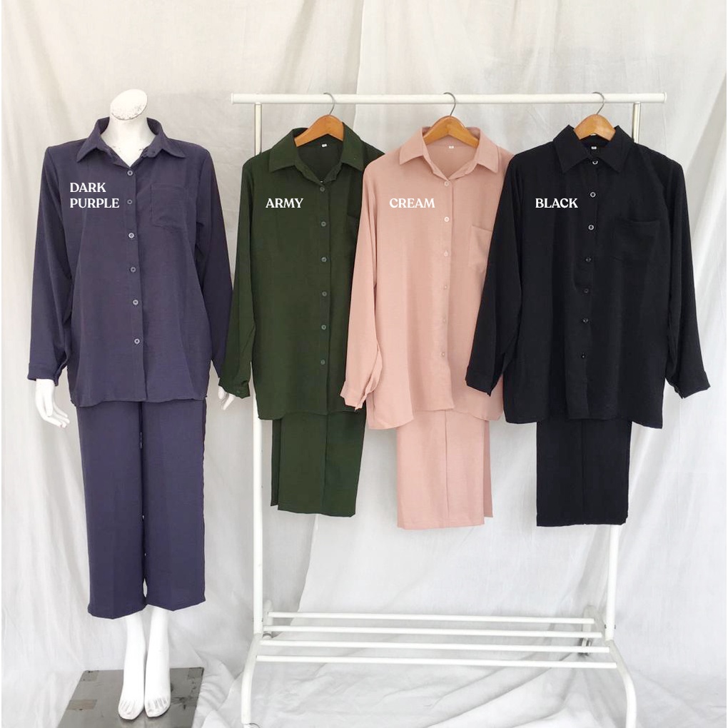 MIEL CRINKLE SET - SETELAN CELANA WANITA BAHAN CRINKLE Setelan atasan kemeja dan kulot polos bahan linen crinkle dengan pinggan karet . Cocok banget buat dipakai untuk macam" acara. Cuttingan premium, tidak sempit dibagian selangkangan, Patrunnya lebar, jahitan rapih, bahan dijamin bagus dan nyaman banget dipakai. Chic dan Simple design.