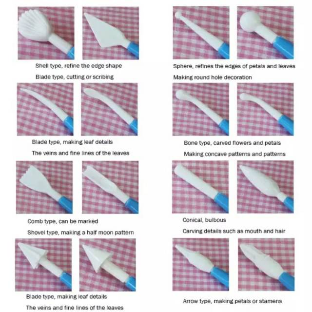 *) Digunakan untuk menambah detil dekorasi icing / fondant *) Berisi 8pcs (dengan 16 bentuk yang bervariasi) untuk membentuk figuring atau model fondant, clay, atau chocolate. *) Panjang bervariasi tergantung model (14-16 cm) *) Sangat cocok untuk pemula atau ahli dekorasi cake *) Material bahan food grade plastic *) Awet dan ringan