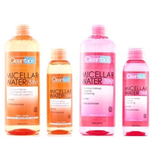Cleanface Micellar Water 3in1 terdapat 4 varian Oily Skin 100 ml Oily Skin 250 ml Normal Skin 100 ml Normal Skin 250 ml