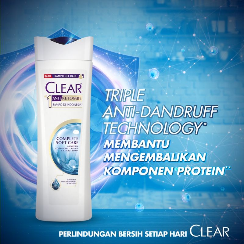 CLEAR Complete Soft Care, Shampo Anti Ketombe Generasi Baru dengan Triple AD Technology yang dilengkapi dengan komponen protein & vitamin B3. Menutrisi komplit, kulit kepala & rambut indah.