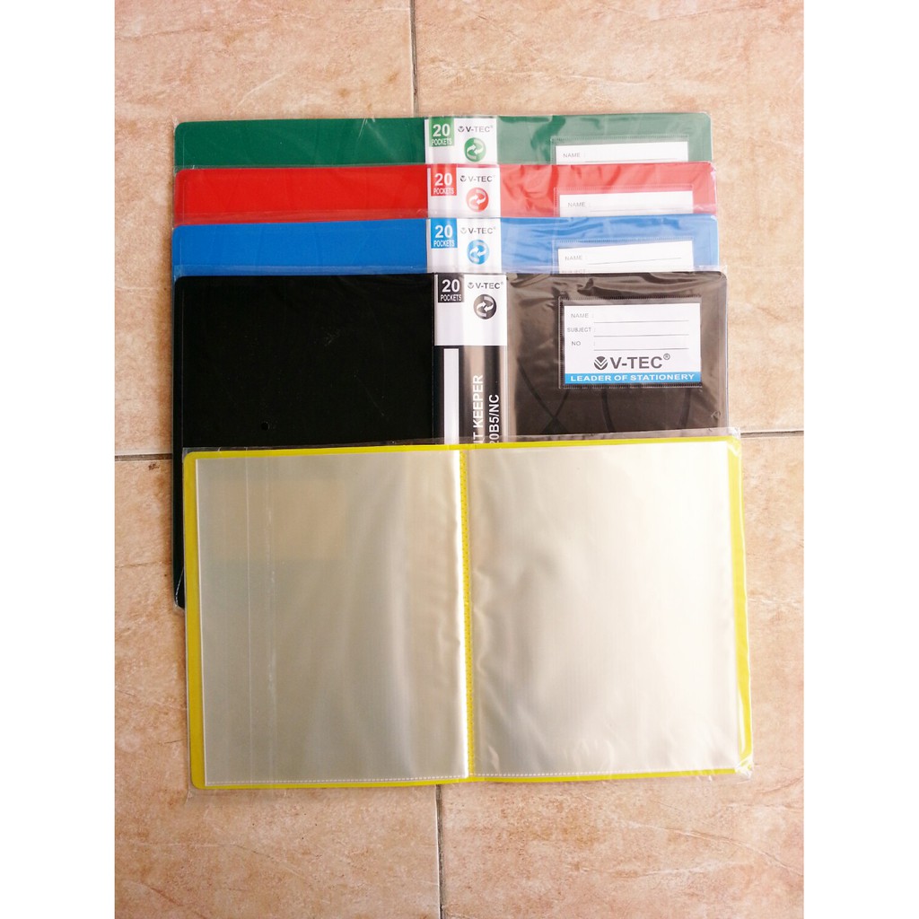 Document Keeper Merk V'Tec Type : VTDK-20B5/NC Bisa digunakan untuk menyimpan dokumen ukuran A5 Berisi 20 lembar kantong, dokumen-dokumen penting anda ukuran A5 dapat tersimpan dengan rapi dan aman di Document Keeper ini. Cover bagian depan dan belakang tebal dan tidak mudah pecah. Ketebalan plastik 1 sisi:8 micron (Plastik polos bening buram) Dimensi : 2 x 24 x 19cm ukuran kertas masuk : 18,4 x 22,7 cm Berat : 260 gr (ditambah kemasan) Tersedia berbagai warna cover : -Hitam -Biru -Merah -Hijau -Kuning