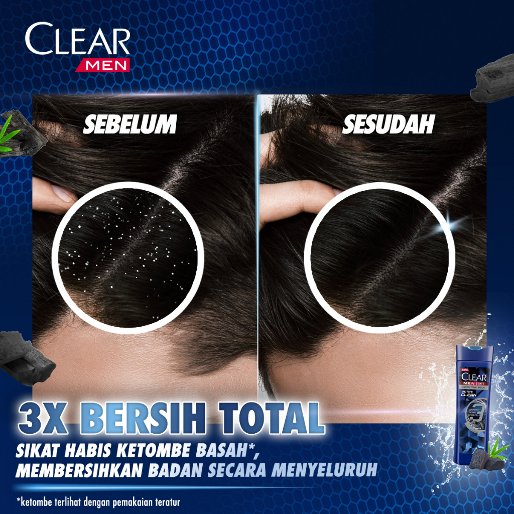 ^dari ketombe � CLEAR Men Shampoo Anti Ketombe 3 in 1 Clean Active Sampo Tonik Sabun 48 Jam Perlindungan Aktif � CLEAR Men Shampoo Anti Ketombe 3 in 1 Clean Active yang menutrisi serta membersihkan kulit kepala, rambut, dan badan. Diformulasikan khusus untuk pria, memberikan perlindungan aktif^ hingga 48 jam.