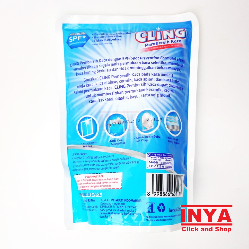 Aturan Pakai: • Tuangkan isi refill CLING pembersih kaca ke botolnya, semprotkan CLING secara merata pada jarak ± 15cm dari permukaan kaca atau perabot yang akan dibersihkan • Keringkan segera permukaan dengan lap bersih.