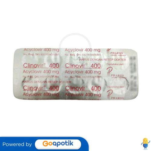 Deskripsi : PENGGUNAAN OBAT INI HARUS SESUAI PETUNJUK DOKTER. Mengandung acyclovir/asiklovir yang digunakan untuk mengobati infeksi yang disebabkan oleh virus seperti varisela zoster (penyebab herpes zoster atau cacar api) dan herpes simpleks (penyebab herpes genital dan cold sore atau luka melepuh di sekitar bibir). | Komposisi : Tiap tablet mengandung acyclovir 400 mg | Dosis : ATURAN PAKAI HARUS SESUAI DENGAN PETUNJUK DOKTER. Herpes simplex kambuhan: Dewasa: 800 mg sehari 2-4 kali, dapat diturunkan menjadi 400-600 mg sehari.Infeksi herpes simplex primer: Dewasa: 200 mg 5 x sehari. Anak <2 tahun: setengah dosis dewasa; >2 tahun: seperti dosis dewasa.Pencegahan herpes simplex pada gangguan imunitas: Dewasa: 200-400 mg 4x sehari, anak < 2 tahun: seperti dosis dewasa.Herpes zoster: Dewasa: 800 mg 5x sehari selama 7-10 hari.Varicella zoster: Dewasa: 800 mg 4-5x sehari selama 5-7 hari, anak >2 tahun: 20 mg/kgBB. | Indikasi : Untuk mengobati infeksi herpes simplex pada kuit dan membran mukosa , pencegahan infeksi herpes simplex pada pasien immuno-compromised, infeksi herpes zoster | Perhatian Khusus : Gunakan dengan hati-hati pada pasien dengan kondisi gangguan saraf, pasien kekurangan oksigen, kelainan elektrolit tubuh, gangguan ginjal, wanita hamil dan menyusui. | Kemasan : Strip 10 tablet | NIE : DKL9321614310B1