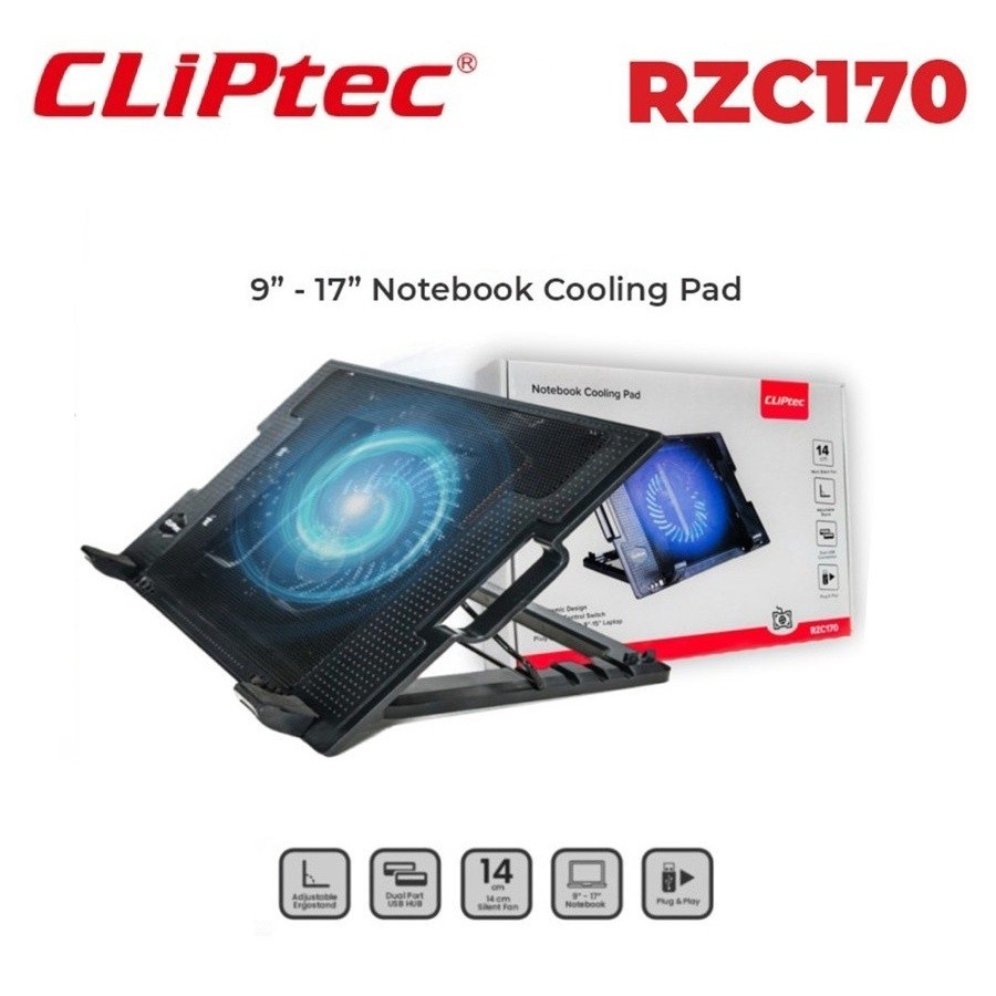Cliptec RZC170 Notebook Cooling Pad Ergostand for 9 - 17Inch CLIPtec RZC170 Notebook Cooling Pad wired notebook coolingpad. Desain coolingpad yang ergonomis dengan kipas 14cm yang tidak bising dan lampu backlight. Coolingpad ini dilengkapi 5 tingkat sudut kemiringan stand coolingpad.