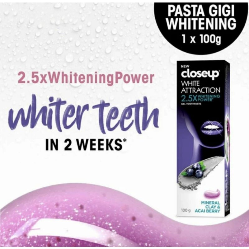 *Dengan pemakaian teratur � Dapatkan senyum percaya diri dan putih alami dengan toothpaste whitening dari Closeup dengan kandungan alami Mineral Clay yang bekerja seperti magnet untuk mengangkat noda yang menumpuk di gigi � Kebiasaan gaya hidup seperti minum kopi ang tidak diimbangi dengan sikat gigi 2x sehari mampu menyebabkan noda menumpuk dan membuat gigi menjadi kuning sehingga membutuhkan perawatan gigi khusus. � Gunakan Pasta Gigi dengan kandungan pemutih alami seperti Closeup White Attraction dengan variant Acai berry yang mampu mengembalikan gigi putih alami dalam 2 minggu � Gunakan Tooth paste Closeup White Attraction Acai Berry dengan rutin 2x sehari (pagi setelah sarapan dan malam sebelum tidur) untuk mendapatkan hasil yang maksimal