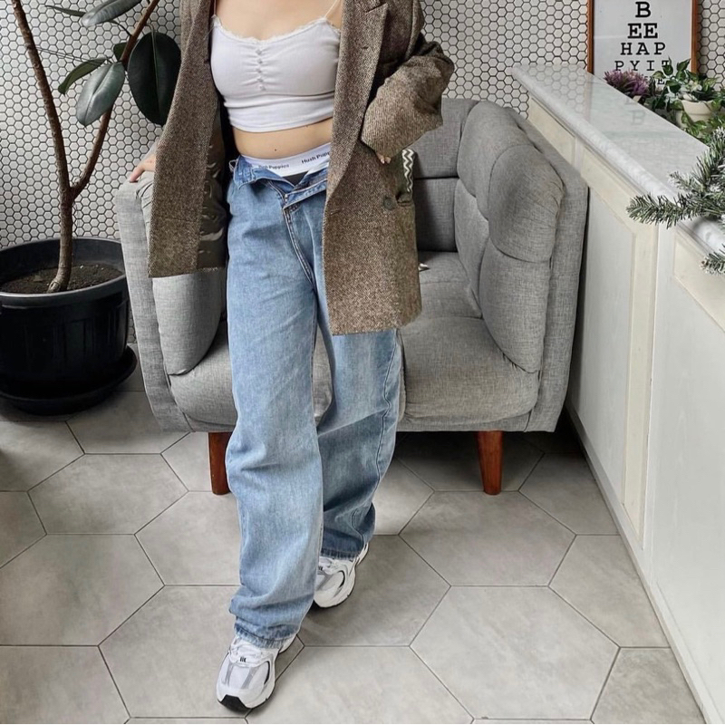 celana wanita highwaist ripped denim baggy wide leg jeans adjustable button loose blue medium unisex snow blue light straight