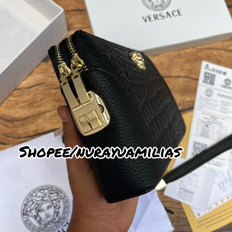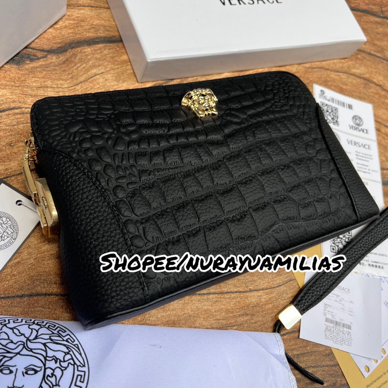 Hand bag kulit asli dari Versace dengan design simple, exclusive & durable, dilengkapi dengan sling pegangan tangan serta kunci pengaman kombinasi angka pada ujung ritsleting. Cukup luang untuk membawa smartphone, dompet panjang/pendek, iPad mini, kunci mobil, dll. ukuran 19x29x6cm. Tersedia pilihan warna hitam.