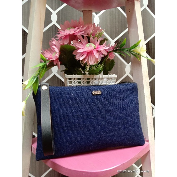 clutch wanita murah berkualitas size 21 x13 warna navy bahan denim ada saku ATM
