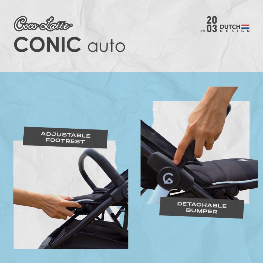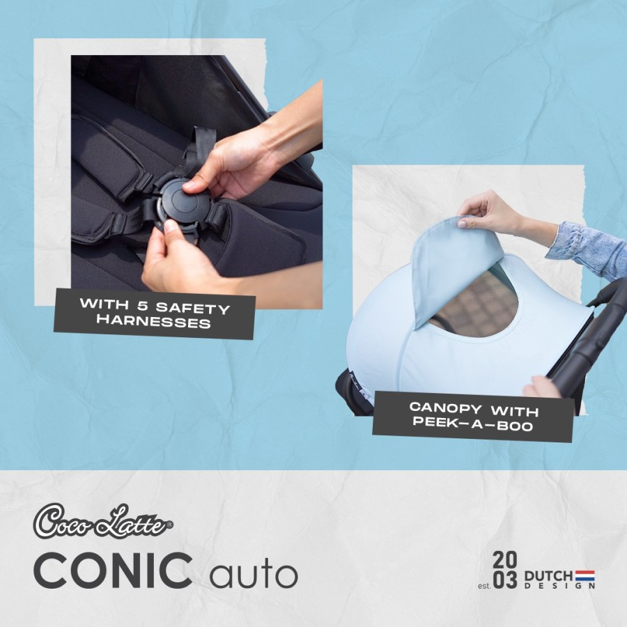 - Auto fold compact stroller - For newborn baby - 20 kgs - Auto-folding system - With 5 Safety Harnesses - Detachable Bumper - Recline Positions - Adjustable Footrest - Brake system - With suspension and 360° swivel front wheels - Canopy with peek-a-boo - Large basket o #Cocolatte #CocolatteIndo #IAmCocolatte #CocolatteConicAuto