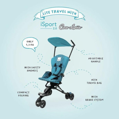 Cocolatte Isport Stroller Traveling merupakan baby stroller berbahan aluminium yang didesain ergonomis untuk usia 6 bulan sampai 3 tahun dengan berat maks 20 kg. Kereta dorong ini memiliki 5 pint safety harness, recline position, canopy dapat dilipat, dapat dilipat orientasi hadap depan, foot brake, roda dapat berputar 360 derajat, dan reversible handle yang dapat diatur tingginya serta dilengkapi jinjing sehingga praktis saat dibawa saat berpergian.
