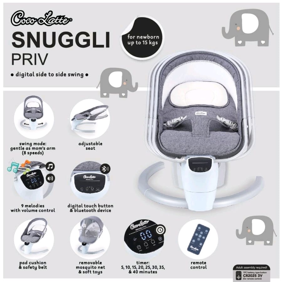 Snuggli Priv: ๐ Newborn up to 15 kgs ๐ Swing mode: gentle as mom's arm (8 speeds) ๐ 9 melodies with volume control ๐ Adjustable seat ๐ Digital touch button and bluetooth device ๐ Pad cushion and safety belt ๐ Removable mosquito net and soft toys ๐ Timer: 5, 10, 15, 20, 25, 30, 35, & 40 minutes ๐ Remote Control