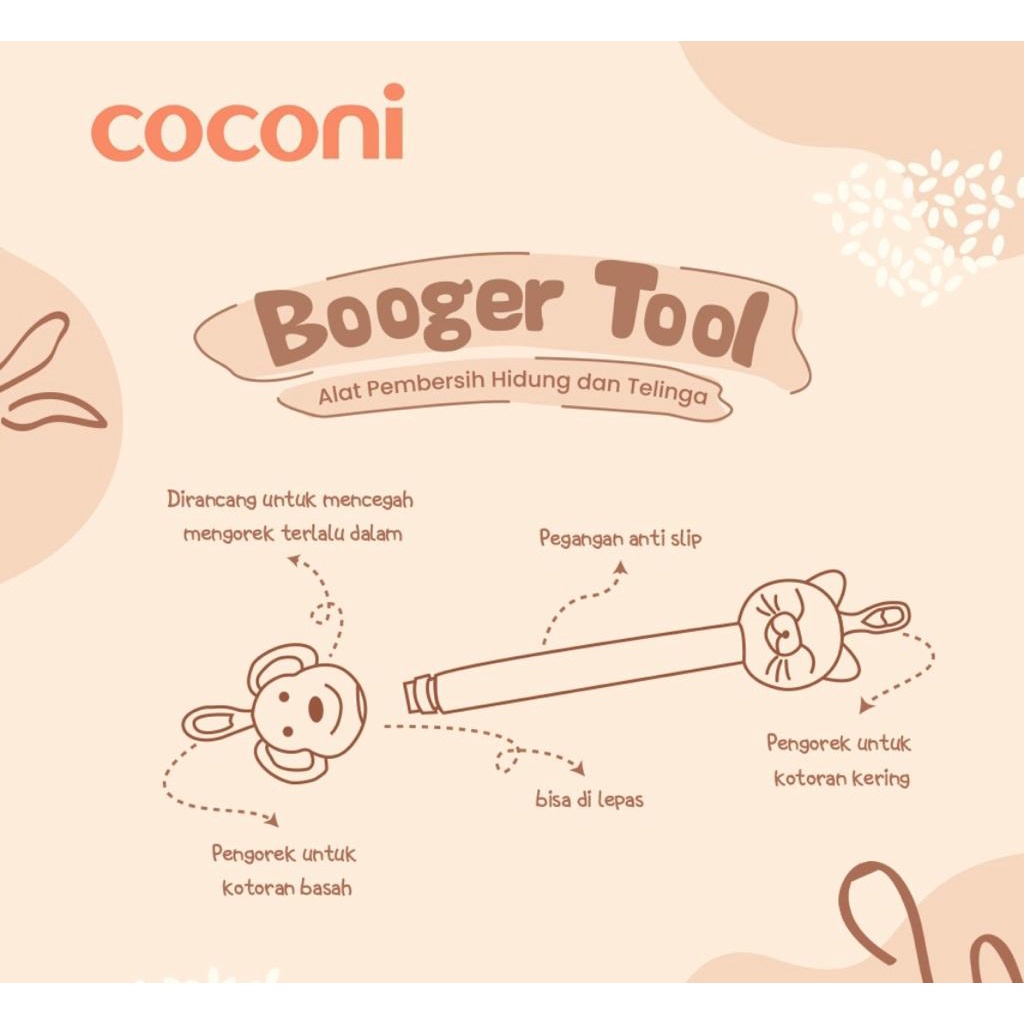 Coconi Booger Tool adalah alat pembersih telinga dan hidung bayi yang dirancang khusus untuk membersihkan kotoran seperti lendir yang lengket maupun kotoran yang sudah mengeras. Bagian scoop (bagian ujung seperti sendok) menggunakan bahan silicon, sehingga tidak akan terasa sakit saat proses pembersihan, anak akan tenang dan nyaman saat dibersihkan.