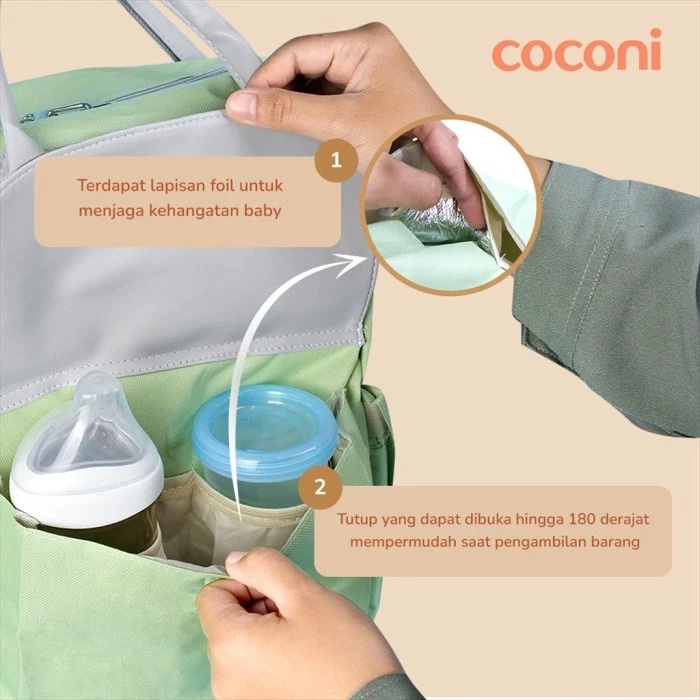 Coconi Mommy Diaper Bag adalah tas serbaguna untuk perlengkapan Mama dan bayi. Desainnya yang modern akan membuat Anda tetap fashionable, ringkas, meski membawa banyak barang. Fitur Coconi Mommy Diaper Bag: - Terbuat dari bahan polyester yang tebal, sehingga tas akan lebih awet, dan kuat - Warna elegan dan terdapat 2 varian warna, sehingga bisa digunakan untuk perempuan dan laki-laki - Bagian penyimpanan botol susu dilengkapi dengan bahan foil untuk menjaga suhu dan kualitas susu bayi - Kapasitas besar dengan 11 kompartemen tas yang berbeda untuk memisahkan barang sesuai dengan kebutuhan - Didesain nyaman untuk punggung jika digunakan dalam waktu lama Coconi Mommy Diaper Bag memiliki 11 kompartemen/bagian tas: Bagian dalam: 1 kompartemen besar 4 kompartemen karet untuk botol Bagian depan: 1 kompartemen sedang 1 kompartemen karet untuk botol yang sudah dilengkapi alumunium 1 kompartemen karet