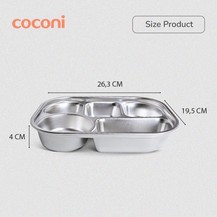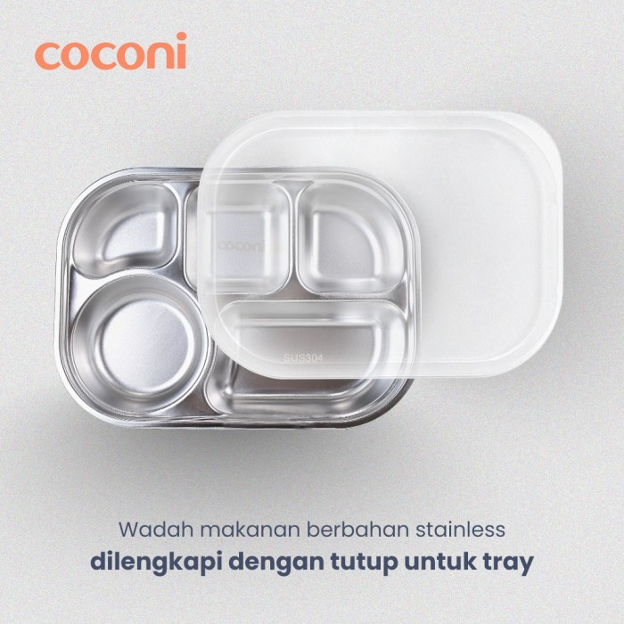 COCONI Premium Stainless Steel Plate Food Tray With Lid adalah piring makan anak / dewasa dengan 5 sekat kompartmen, terbuat dari bahan Stainless Steel SUS 304 FOOD GRADE, di lengkapi tutup agar makanan tetap hangat dan higenis