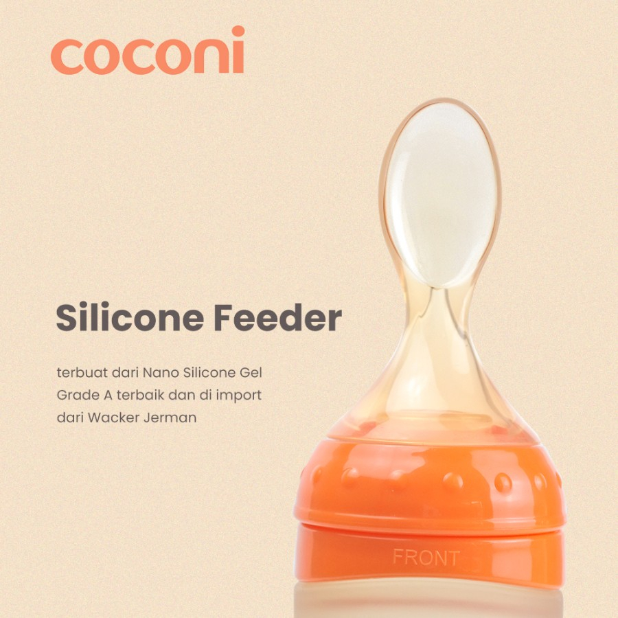 Coconi Silicone Baby Feeder Spoon adalah botol sendok dengan soft squeezer system yang didesain untuk membantu ibu memberikan makanan semi padat kepada bayi. Jika biasanya si ibu harus menggunakan dua tangan dimana satu tangannya untuk memegang mangkok/piring dan satunya lagi untuk memegang sendok, lebih praktis digunakan dimana ibu cukup memeras botol dengan satu tangan dan sudah langsung dapat menyuapi makanan ke buah hati tercinta. Tidak hanya terbuat dari material yang aman dan bersih, juga didesain dengan lengkapi dengan tutup untuk melindungi bayi dari kontaminasi debu serta lembut sehingga tidak akan melukai mulut bayi.