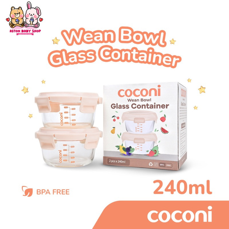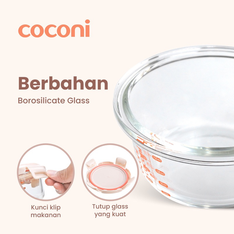 COCONI Wean Bowl Glass Container terbuat dari kaca borosilicate berkualitas, tahan suhu dingin maupun panas, dapat di pakai ke kukusan langsung, menyimpanan makanan MPASI lebih mudah dan akurat.