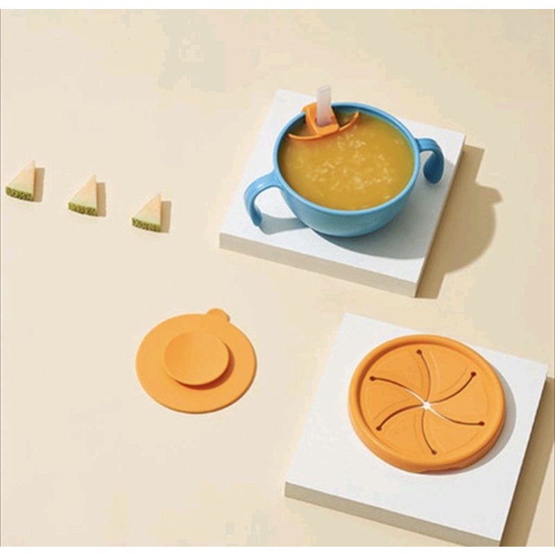 * Fungsi 3-IN-1 Berfungsi sebagai suction bowl dengan suction yang kuat sehingga snack bowl tidak mudah geser bila tersenggol , straw bowl yang memudahkan si Kecil minum soup maupun smooties dan snack bowl dengan tutup silikon yang lentur agar snack tidak mudah tumpah namun mudah diambil.