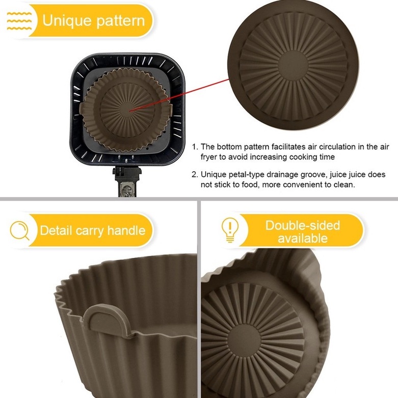 * 1.Panci silikon sangat lembut dan fleksibel sehingga Anda hanya perlu memutarnya dan mencucinya dengan air hangat. *(2).Tidak ada lagi pembersihan keranjang penggorengan udara, menjaga makanan outdoor fryer, lemak dan kotoran tanpa merusak masa manfaat penggorengan udara.