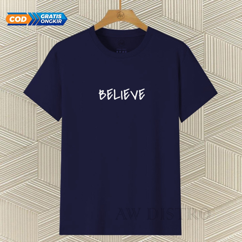 Detail COD Baju Kaos Distro Believe Text Putih Premium Quality Lengan Pendek