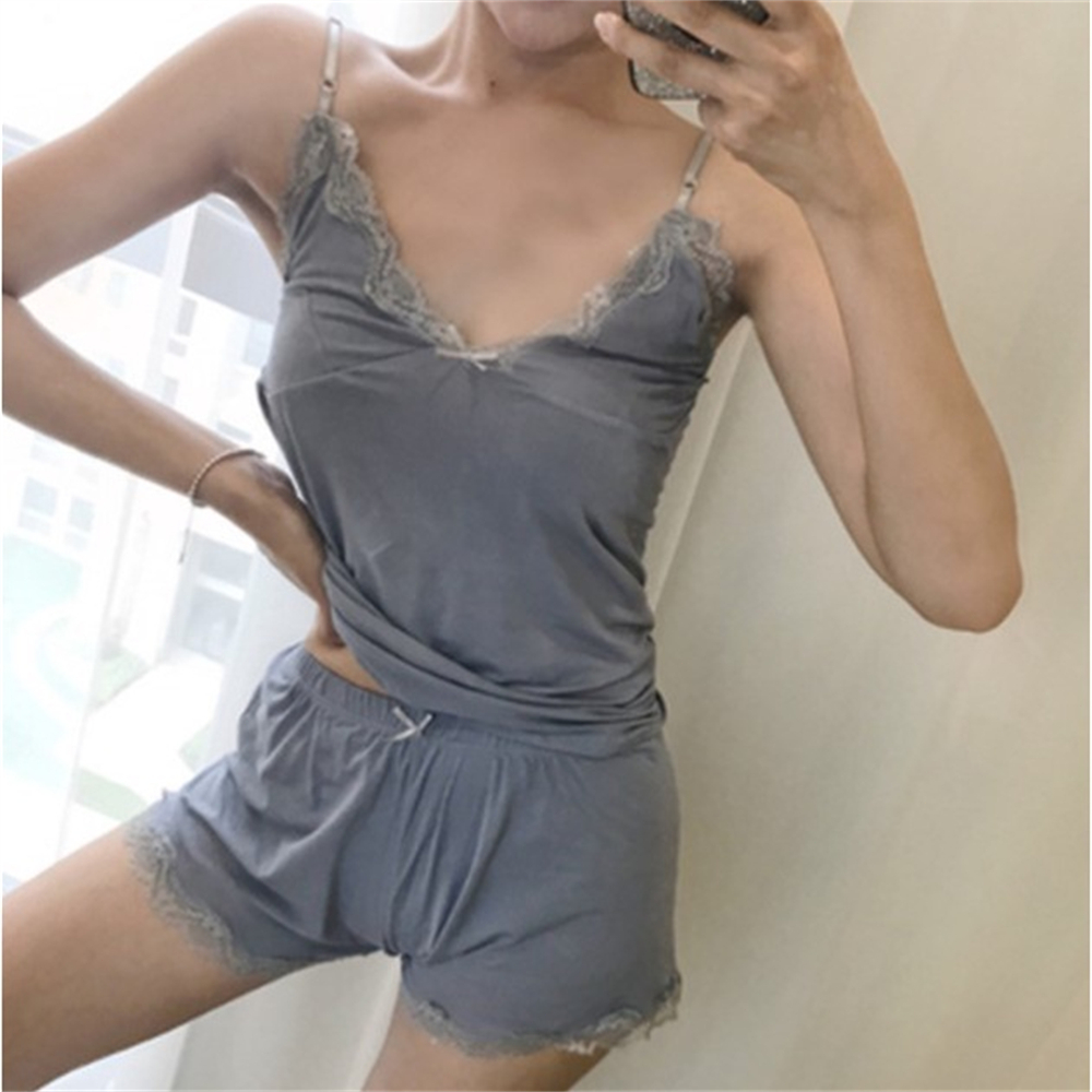 Pakaian Wanita > Pakaian Tidur & Piyama > Piyama > 【COD & Barang ready】Setelan piyama tank top atasan + celana pendek hitam set renda piyama wanita atasan & high waist celana pendek