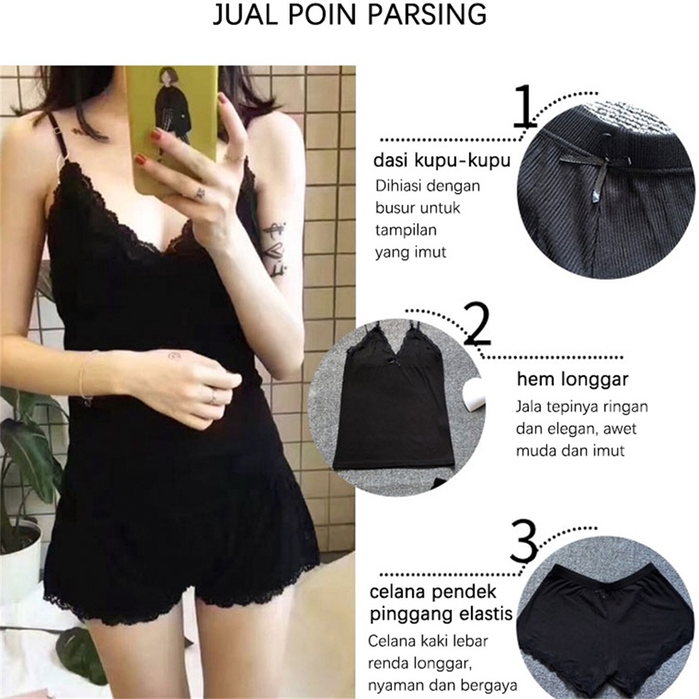 Detail 【COD & Barang ready】Setelan piyama tank top atasan + celana pendek hitam set renda piyama wanita atasan & high waist celana pendek