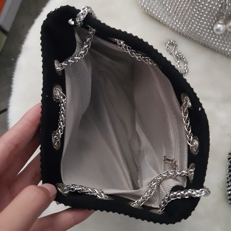 Tersedia Warna : Black, Beige, Pink, Silver Original : China Bahan : Kanvas + Squen Lebar : 22cm Tinggi : 14cm Dalam : 10cm Tutup Tas : Serut Tali Panjang : Ada Berat : 350grams