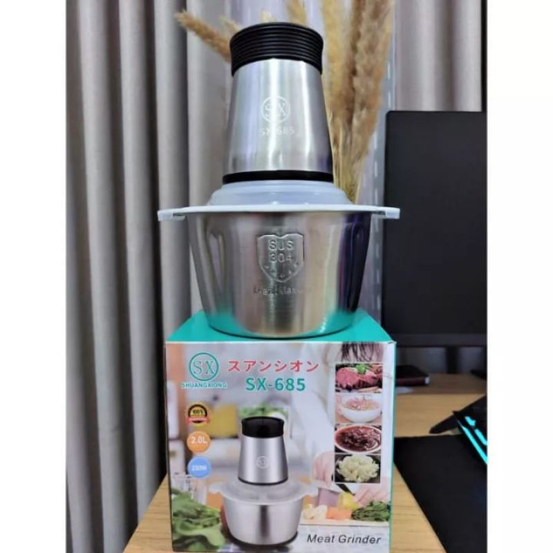 Spesifikasi Produk: Nama Produk : Blender SX Penggiling Daging Voltage : 220V~240V 50HZ~60HZ Watt : 250 W Kualitas bahan : food grade 304 stainless steel Kualitas pisau : 2 tingkat stainless steel, 4 mata pisau Ukuran produk : 230 mm x 270 mm