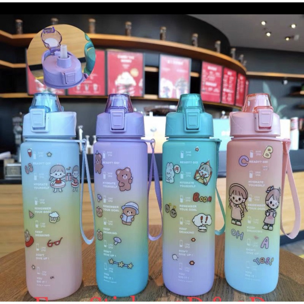 Botol Minum 1 Liter Tutup Flip Dengan Sedotan Tempat Minum Air Penanda Waktu
