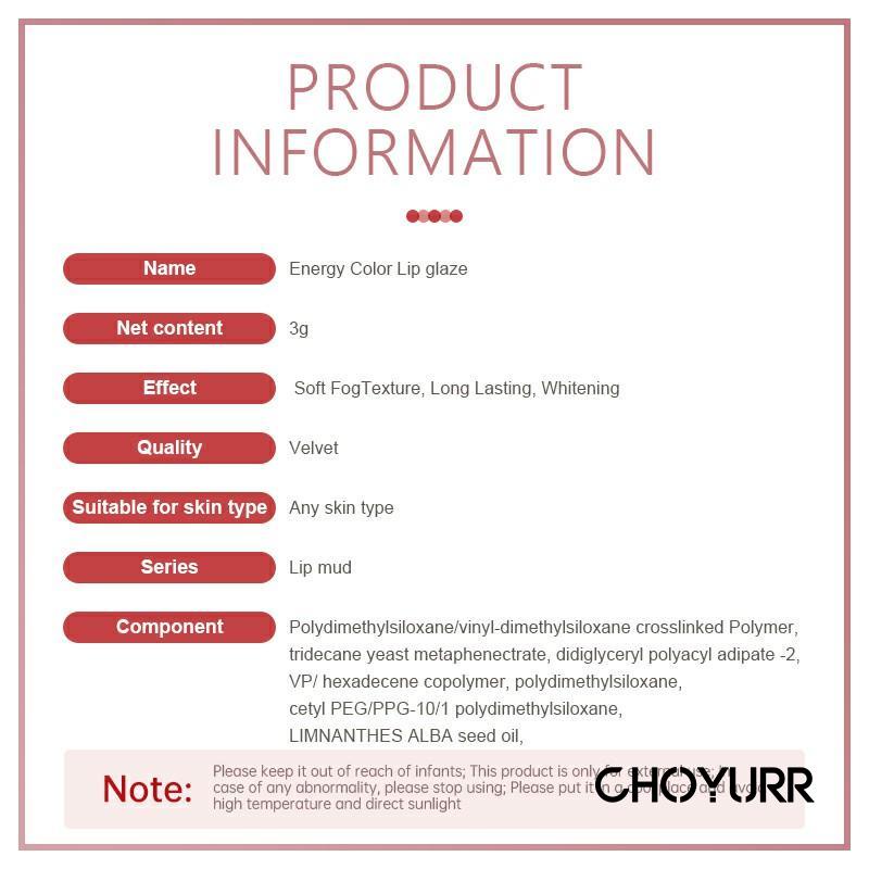 Seri Warna Energi Lip Glaze Velvet Tekstur Kabut Lembut Tekstur Kabut Pemutih Matte Lip Gloss yang Tahan Lama