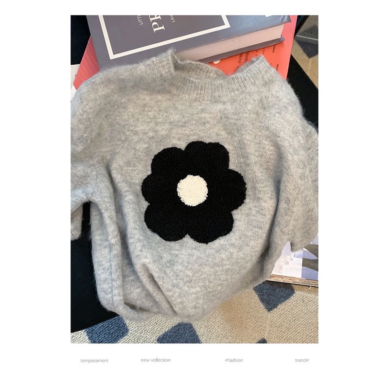 Detail COD##Cartoon sweater rajut lengan pendek / Atasan Rajut Lengan Pendek Bunga Abu-abu / rajut crop top premium