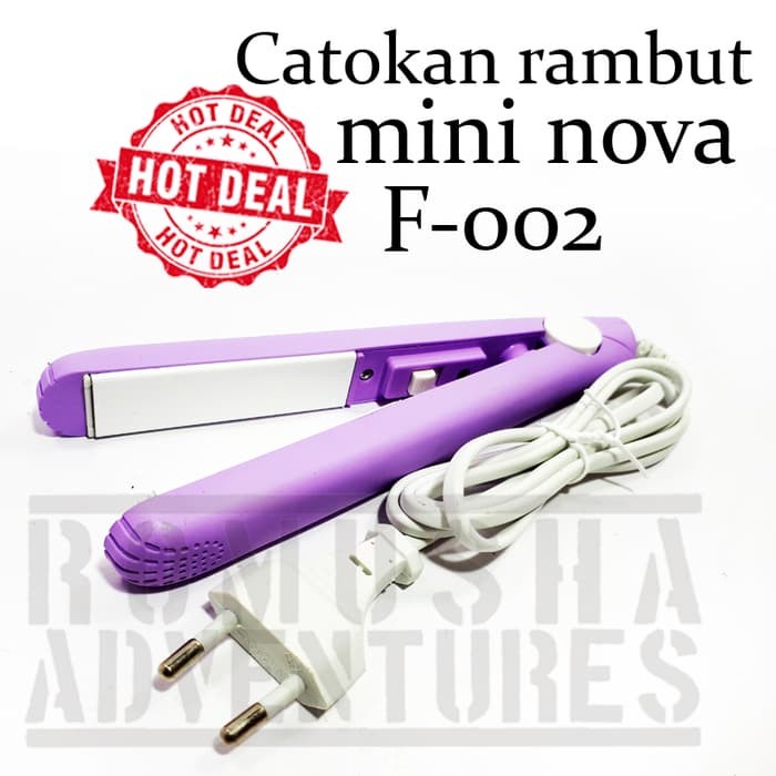 Nova F-002 - Dapat digunakan untuk meluruskan - Ukurannya kecil sehingga praktis dan mudah dibawa travelling - Ada tombol on/off - Tidak ada pengatur suhu - Panjang catok +/- 17 cm - Ukuran plat 1,8 cm x 6,5 cm - warna tolong ditanyakan terlebih dahulu - Daya: 30 W