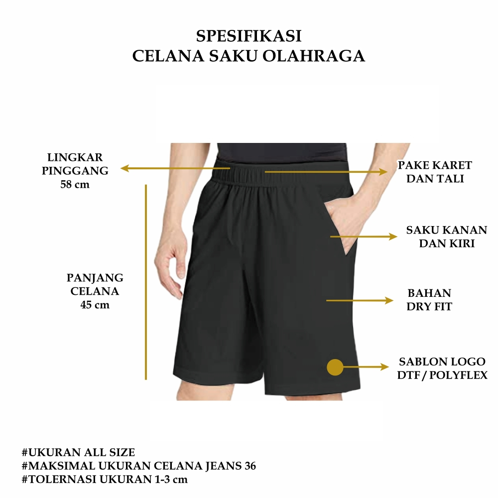 DESKRIPSI PRODUK : - BAHAN DRY FIT - UKURAN ALL SIZE - UKURAN CELANA JEANS 36 MASIH BISA - LINGKAR PINGGANG 58 cm - PANJANG CELANA 45 cm - TOLERANSI UKURAN 1-3 cm - SABLON LOGO DTF / POLYFLEX - ADA SAKU (KANAN DAN KIRI) - BAHAN ADEM DAN NYAMAN - BISA DIPAKAI UNTUK PRIA ATAU WANITA - BISA DIGUNAKAN UNTUK KEGIATAN SEHARI HARI, OLAHRAGA (SEPEDA, LARI, BASKET, FUTSAL, BADMINTON, BOLA, VOLI, DLL.) ATAU AKTIFITAS LAINNYA