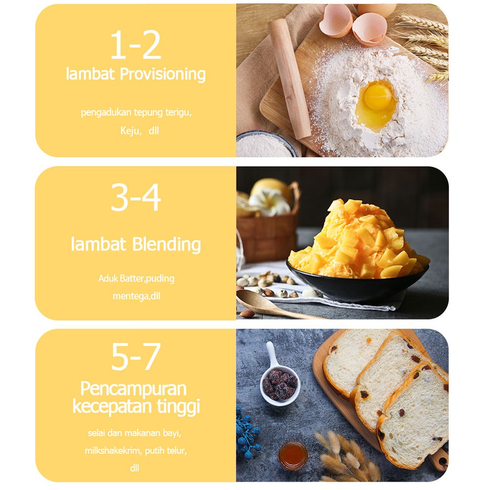 Mixer ini Gratis 4 Pengaduk memudahkan pencampuran,pegadukan telur, mentega, krim, tepung, adonan, dll. Dengan 7 kecepatan Mixer ini juga jauh lebih mudah dan lebih cepat daripada metode tradisional yang dicampur dengan tangan berkali-kali.