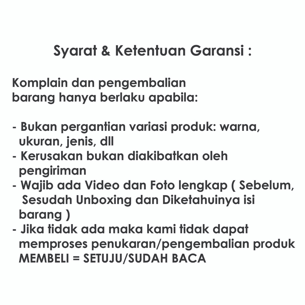 Syarat & Ketentuan Garansi : Komplain dan pengembalian barang hanya berlaku apabila: - Bukan pergantian variasi produk: warna, ukuran, jenis, dll - Kerusakan bukan diakibatkan oleh pengiriman - Wajib ada Video dan Foto lengkap (Sebelum, Sesudah Unboxing dan Diketahuinya isi barang) - Jika tidak ada maka kami tidak dapat memproses penukaran/pengembalian produk MEMBELI = SETUJU/SUDAH BACA