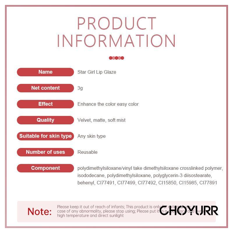 Fitur Elemen Gadis Bintang, Kreatif, Desain Gantungan Kunci, Kabut Beludru, Matte, Pelembab Tekstur Lembut: Matte lip gloss bertekstur ringan, lembut seperti beludru dan segar, oleskan tipis-tipis di mulut Anda tanpa terasa lengket dan menggumpal, kemampuan warna yang tinggi, efek riasan yang natural dan nyaman, ringan dan tidak berat, membuat Anda menjadi gadis yang mempesona di tengah keramaian. Warna Inovatif: Lip gloss mengadopsi formula terobosan yang mengandung warna terbaru dan lebih tahan lama, sehingga tidak hanya mudah diaplikasikan, tetapi juga membuat Anda tetap dalam kondisi paling alami. Seperti beludru dan halus, dapat membuat Anda lebih unik di tengah keramaian. Ukuran yang nyaman: Lipstik ini mudah dibawa dan cocok untuk berbagai acara seperti perjalanan, kantor, pesta, bar, pernikahan, dll. Ini juga merupakan hadiah yang sempurna untuk teman wanita pada hari Natal, ulang tahun, dan hari jadi.