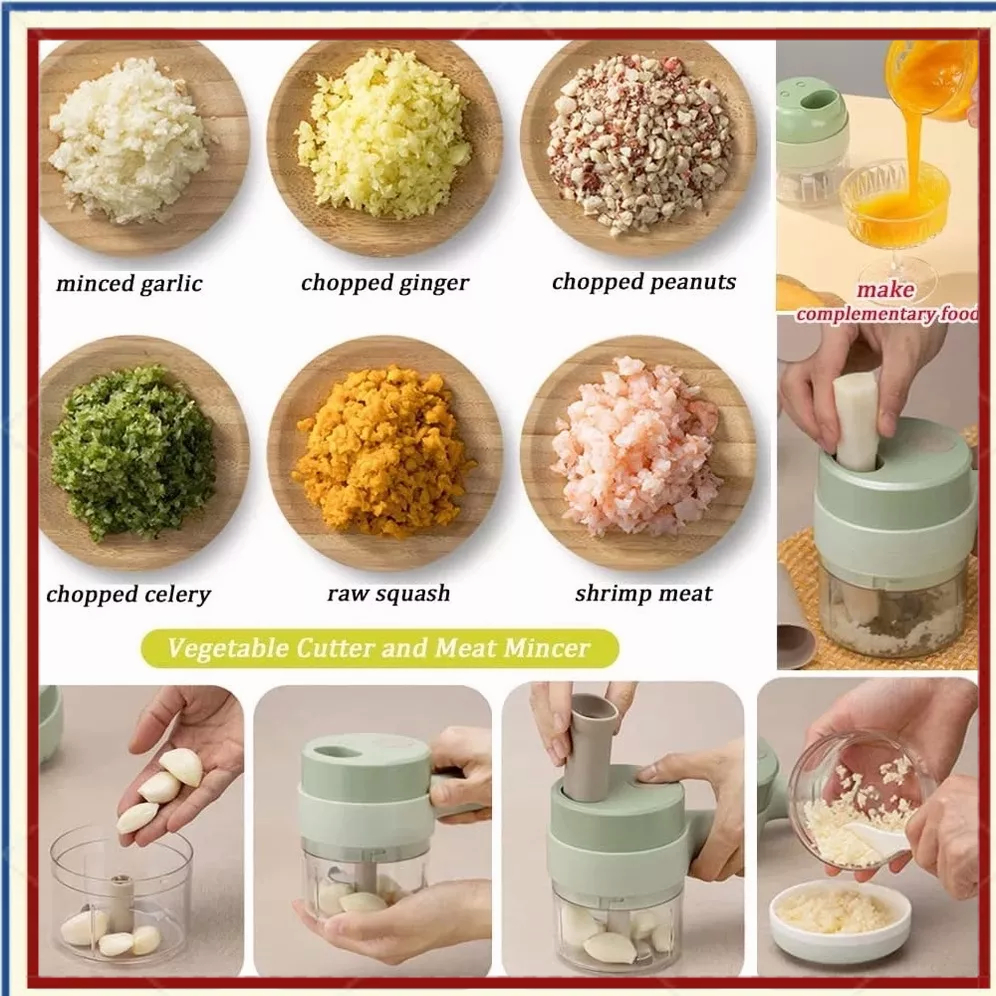 Elektronik > Perangkat Dapur > Juicer, Blender & Mesin Kacang Kedelai > 【COD】Handheld Electric 4 In 1 Vegetable Slicer Cutter Garlic Chili Vegetable Crusher Kitchen Tool USB Charging Ginger Masher Machine
