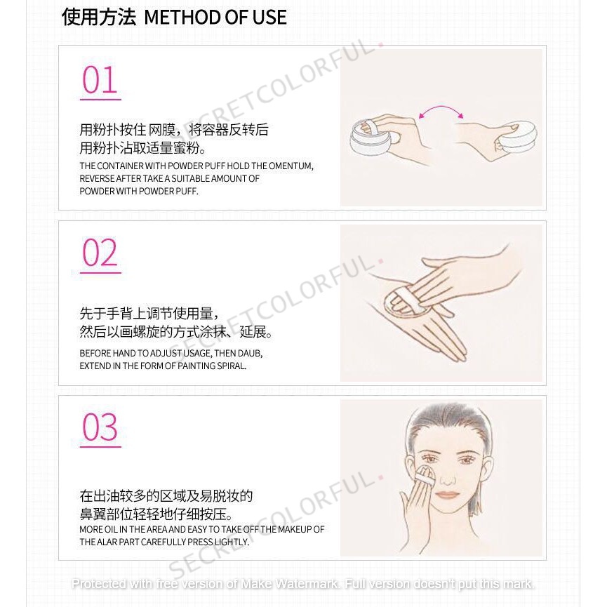 Usage : Use the puff to hold the omentum, reverse the container after the puff with the amount of powder, before the back of the hand to adjust the amount of use, and then to draw a spiral way to spread, easy to get up in the nose parts please gently To-press carefully.