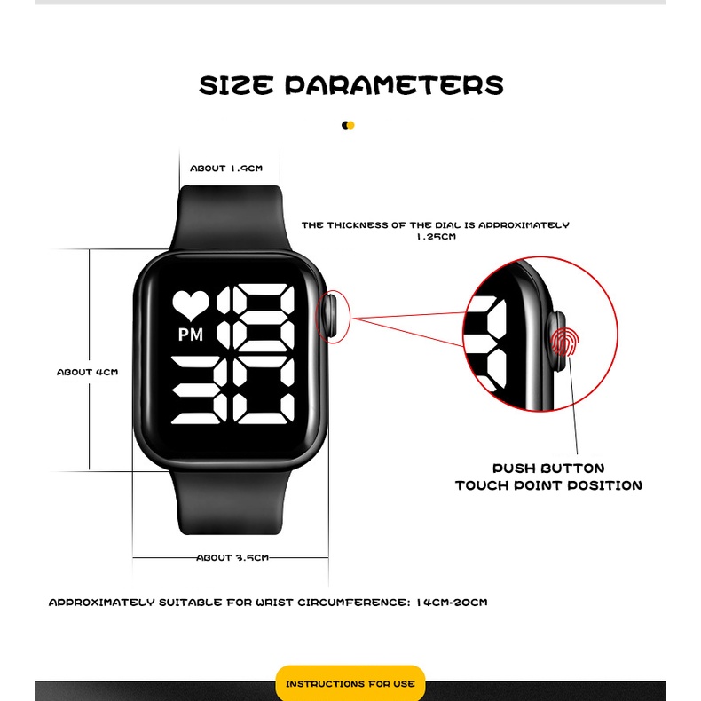 product description: Special functions: luminous, calendar, 24-hour indication, month display Display type: number Applicable people: general Style: Korean, business, leisure, sports Waterproof: Yes Waterproof performance: 50m Movement type: electronic Movement origin: China Dial diameter: 35mm Thickness: 12.5mm Crown type: crown guard, bridge guard Clasp style: horseshoe buckle Buckle material: rubber buckle Strap material: PU Dial shape: square Case material: high-quality ABS material Packing specification: OPP Color: black yellow light, gray yellow light, pink yellow light, ivory white yellow light, black white light, gray white light, pink white light, ivory white light Screen size: 1.2 inches Wearing method: wrist strap Mode of operation: touch Product weight: 0.023KG Package includes: 1pcs watch