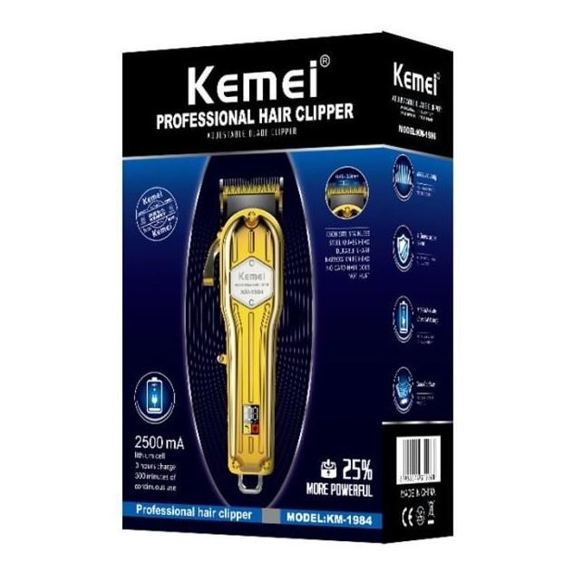 Deskripsi Kemei KM-1984 hair clipper Adjustable carbon steel electric hair KEMEI KM-1984 Profesional Pisau keramik baja titanium, tajam, tahan lama, efisiensi pemotongan tinggi. Kepala pemotong berbentuk T, desain gantung, aman dan cepat. Sisir pemosisian yang dapat dipertukarkan, kontrol bebas panjang batas. Kebisingan rendah dan daya yang kuat. Tegangan support universal.