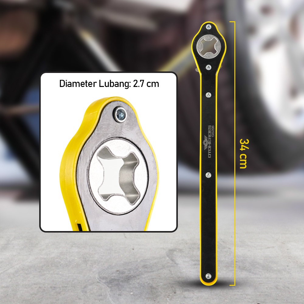 Spesifikasi OTOHEROES Kunci Pas Dongkrak Mobil Ratchet Wrench Rocker Material Besi dan Plastik Dimensi Panjang: 34 cm Diameter Lubang: 2.7 cm