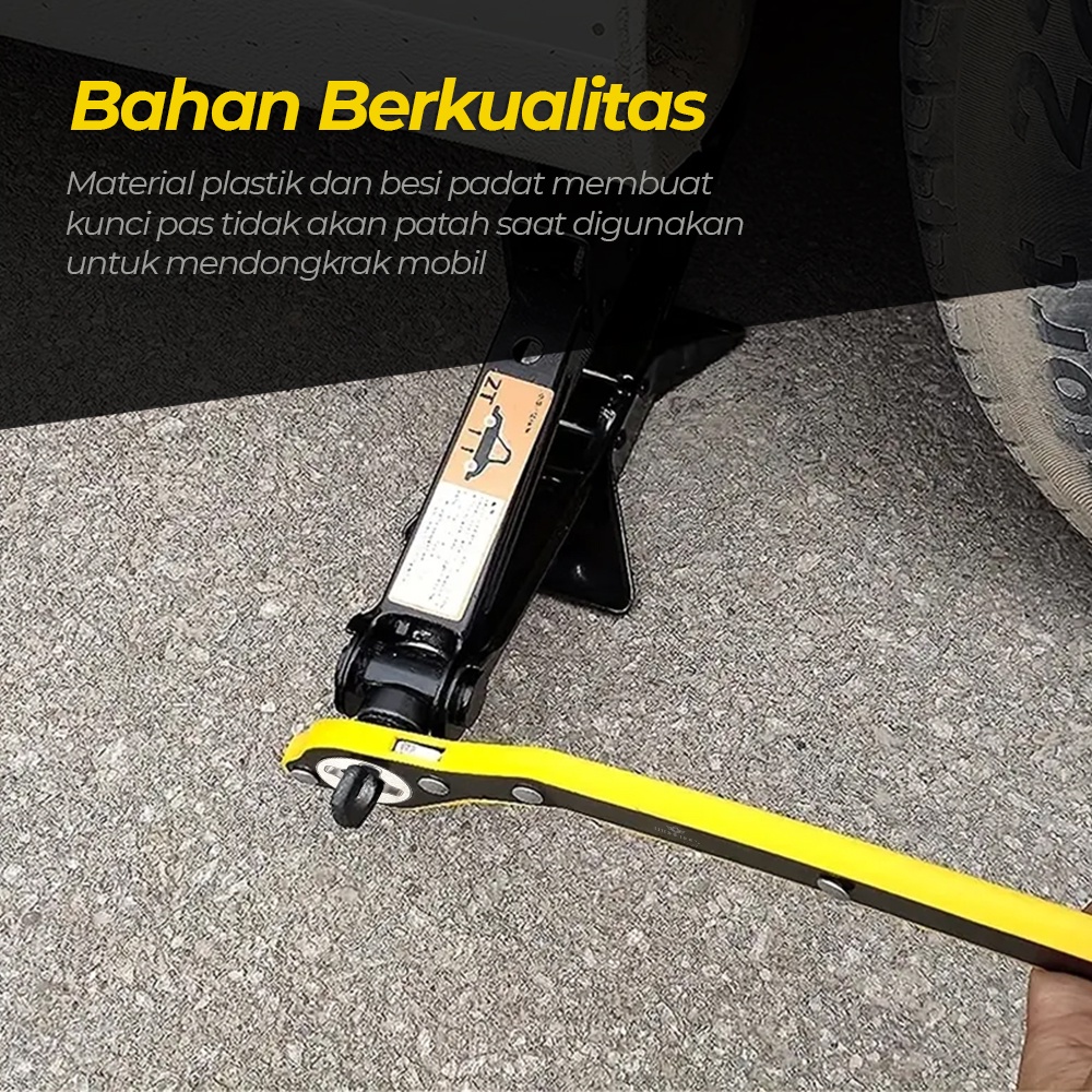 Bahan Berkualitas Material plastik dan besi padat yang digunakan membuat kunci pas tidak akan patah saat digunakan untuk mendongkrak mobil. Bahan besi berkualitas ini juga memastikan keamanaan saat proses mendongkrak mobil.